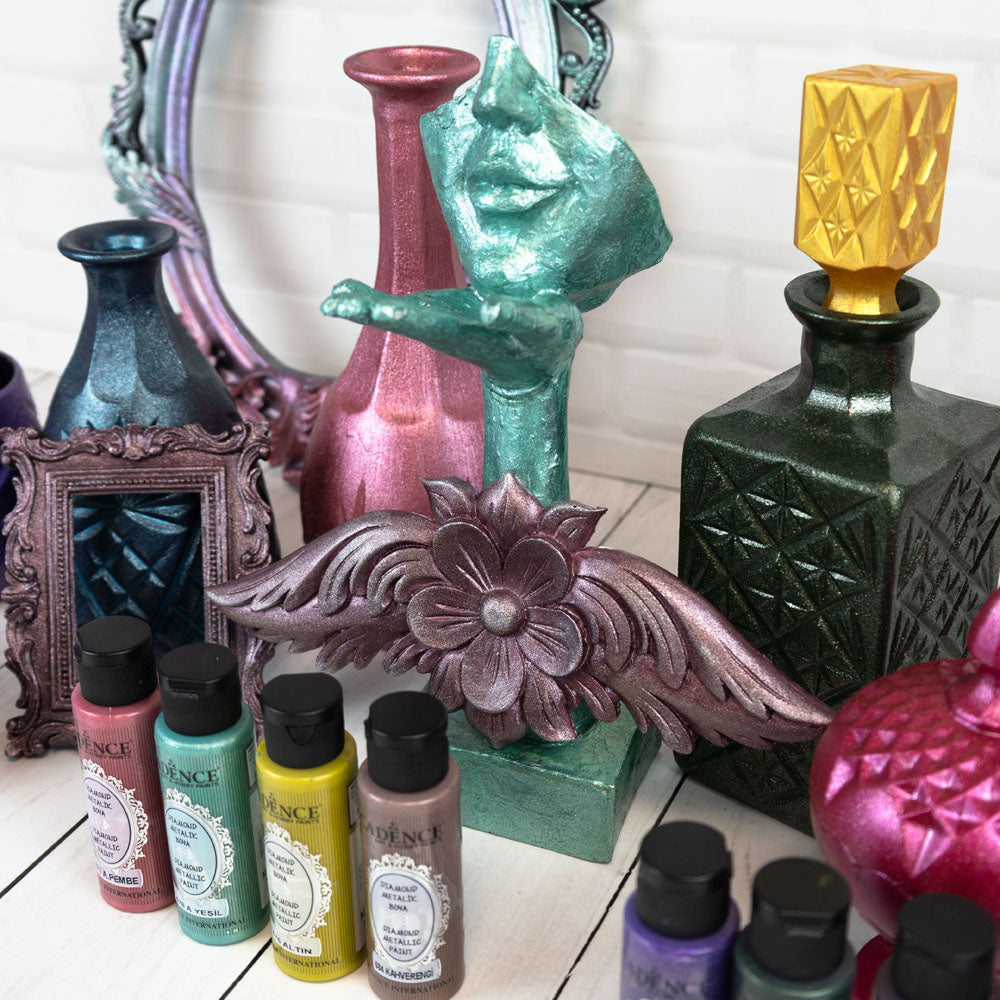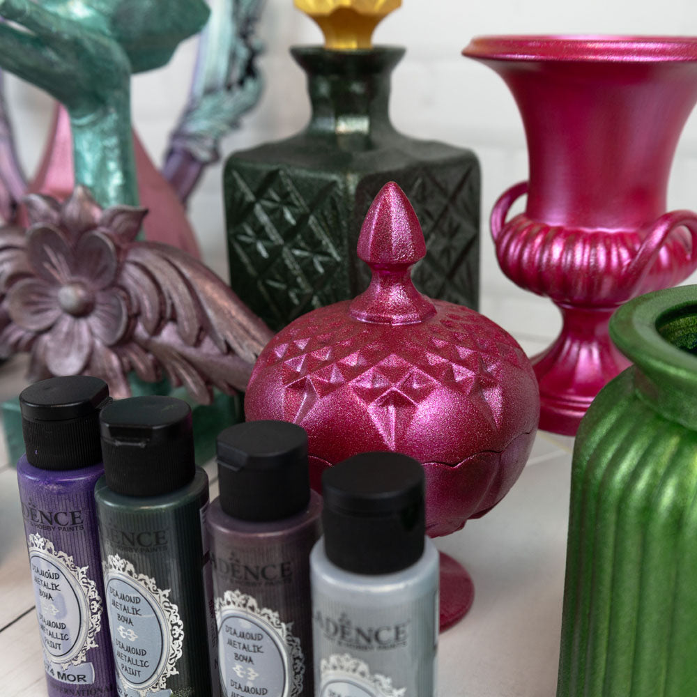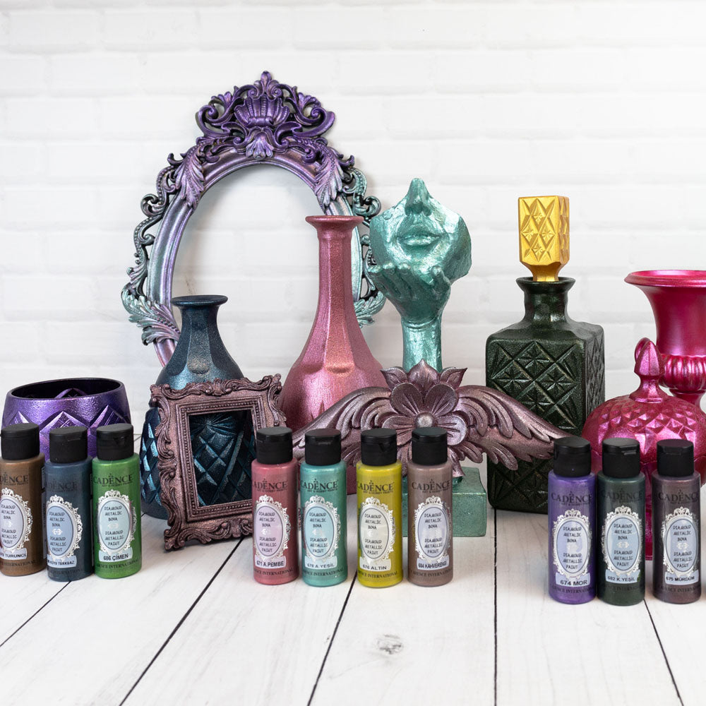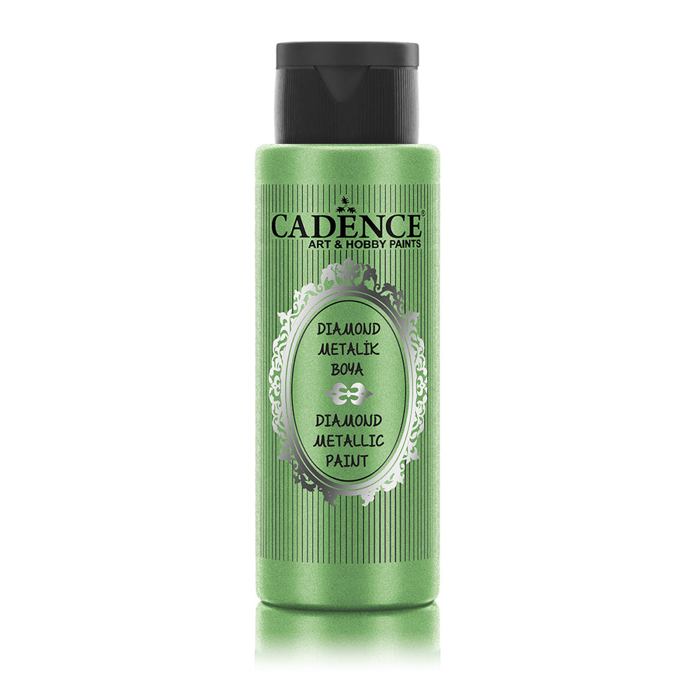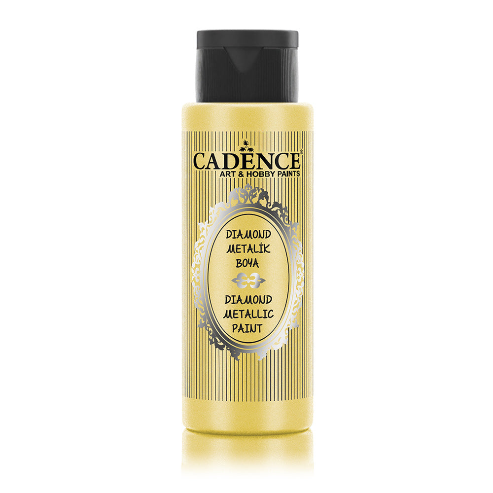 Cadence Diamond Metallic Paint is a high-quality, water-based paint designed for both indoor and outdoor craft projects and decorative painting. This paint features finely ground metal flakes that create a stunning diamond-effect glint, making it perfect for adding metallic accents to various surfaces.