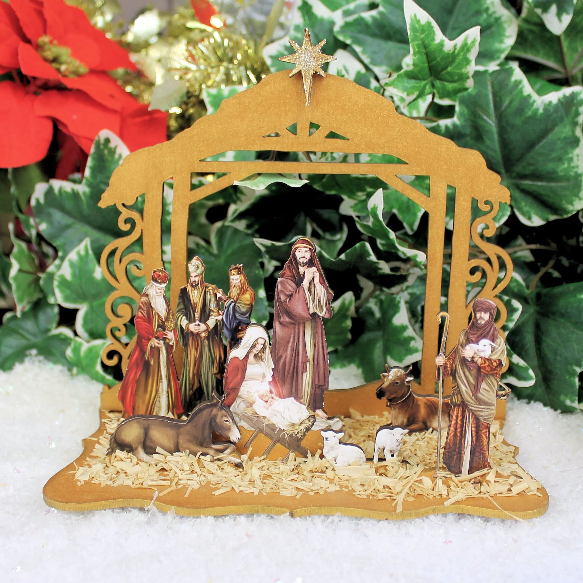 Contents: 11x MDF Nativity Pieces, 1x MDF Stand