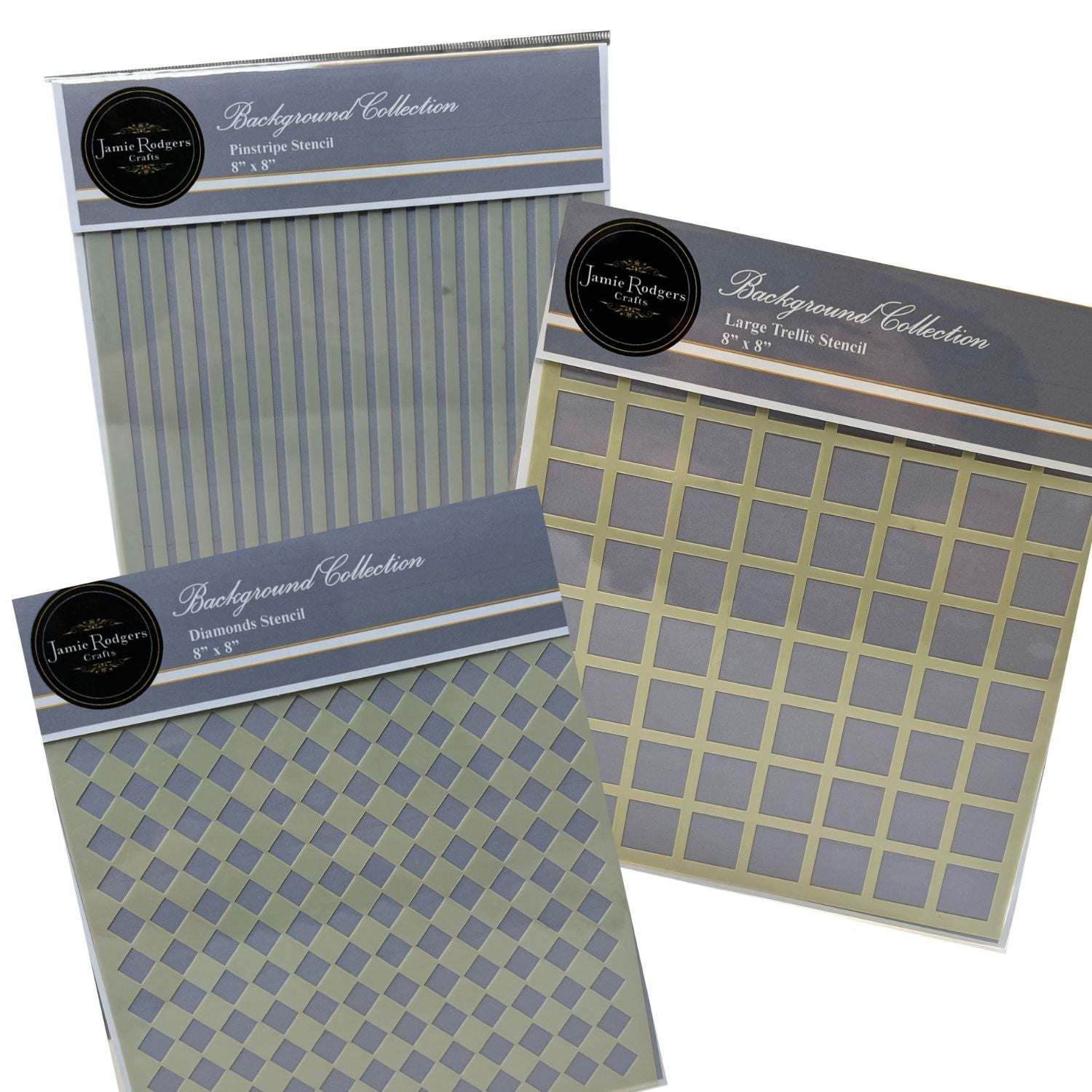 Add elegant texture and stunning detail to your projects with the Jamie Rodgers Crafts 8x8 Background Stencils Bundle. Featuring three unique designs—Diamonds, Pinstripes, and Large Trellis—this bundle offers versatile options for backgrounds and layering in mixed media, scrapbooking, cardmaking, and more.
