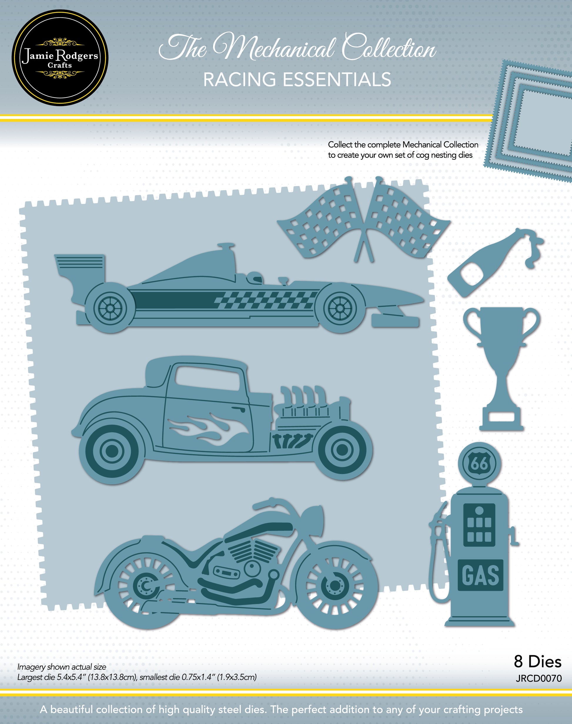Accelerate your creativity with the Jamie Rodgers Crafts Racing Essentials Die. Add this exciting set to your crafting collection today and create high-speed designs that stand out!