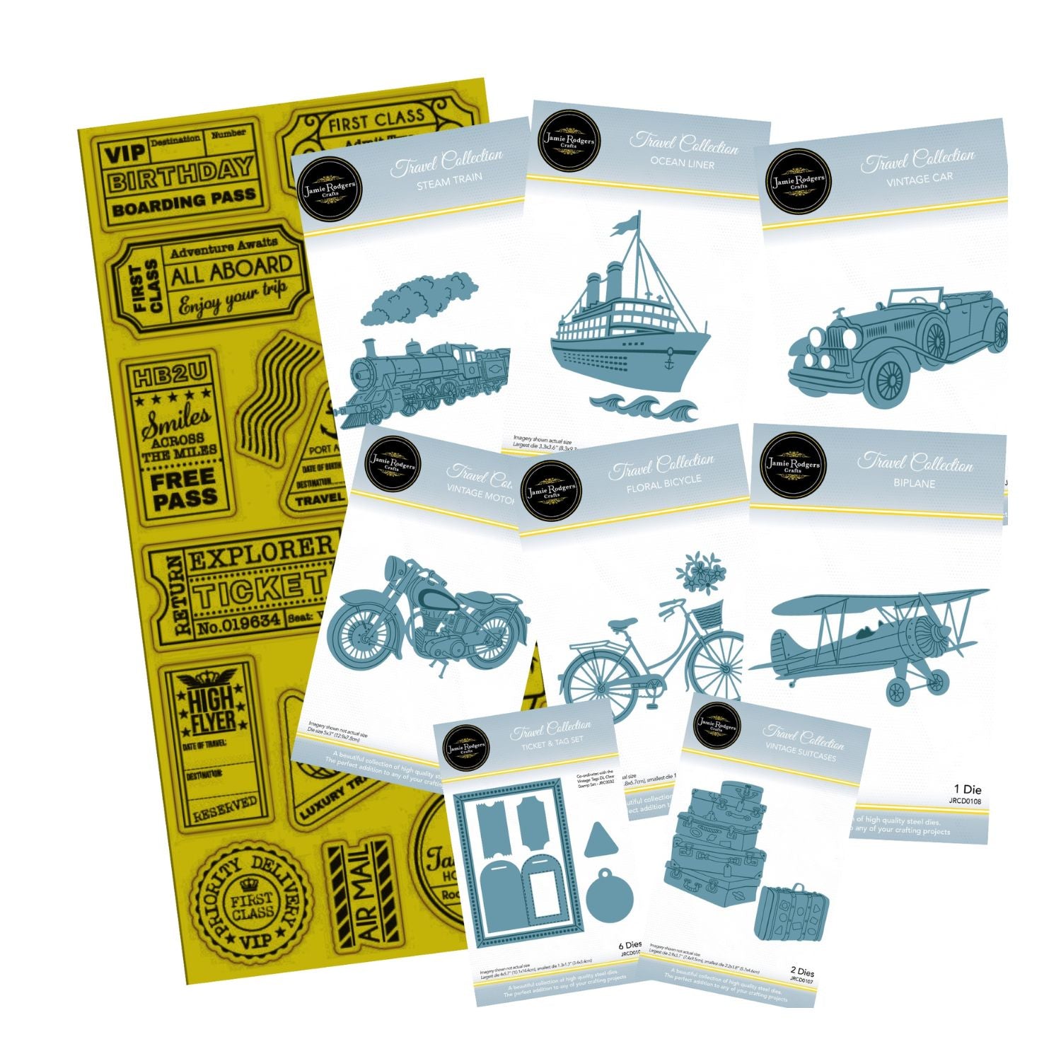 Embark on a nostalgic crafting adventure with the Jamie Rodgers Crafts Travel Collection Bundle. This comprehensive set includes 8 intricately designed vintage travel-themed die sets and a coordinating DL clear stamp set, perfect for creating timeless cards, scrapbooks, journals, and mixed media projects.