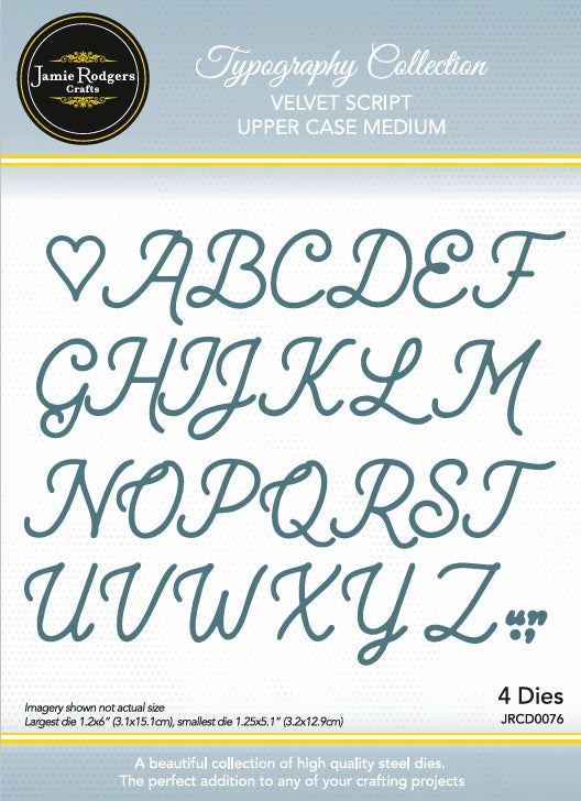 Bring elegance to your projects with the Jamie Rodgers Crafts Velvet Script - Upper Case Medium Die Set. Add this beautiful die set to your crafting collection today and start creating sophisticated, personalised designs with ease!