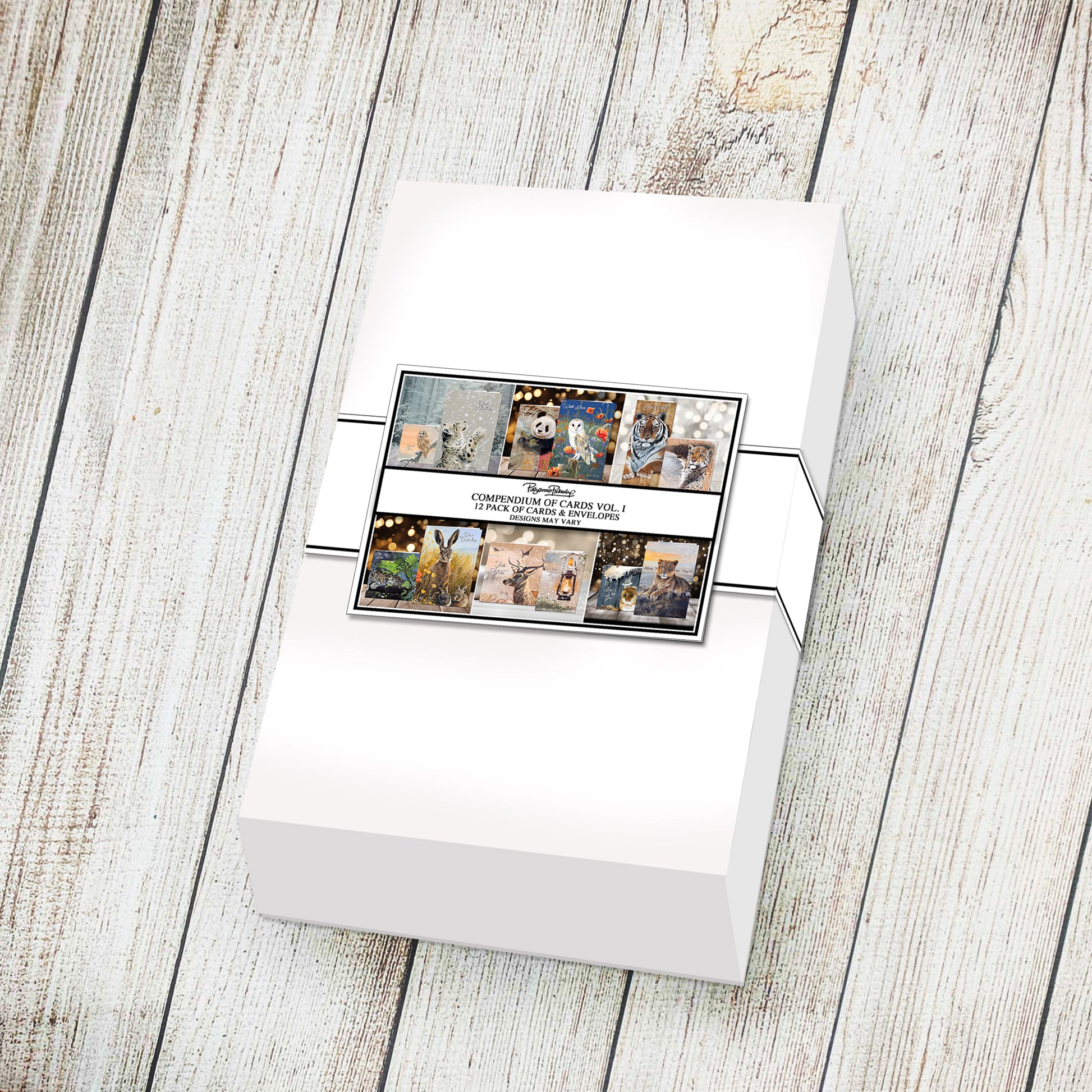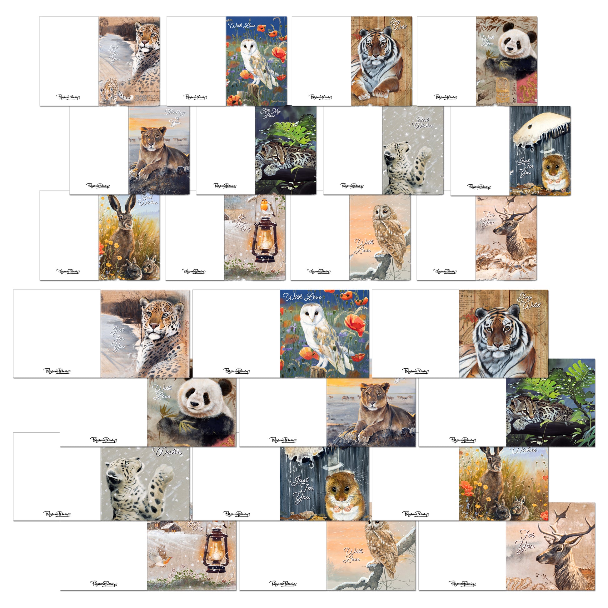 A beautiful collection of 12 pieces of Pollyanna's artwork in 7 sizes of cards with matching inserts & envelopes together with boxes, belly bands & contents list to make up boxes of ready-made cards to gift or sell. Perfect for raising money for animal charities.