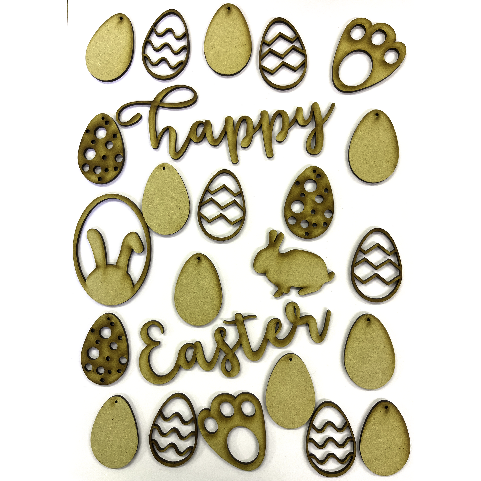 24 MDF Easter elements, including bunny, eggs, and sentiment.