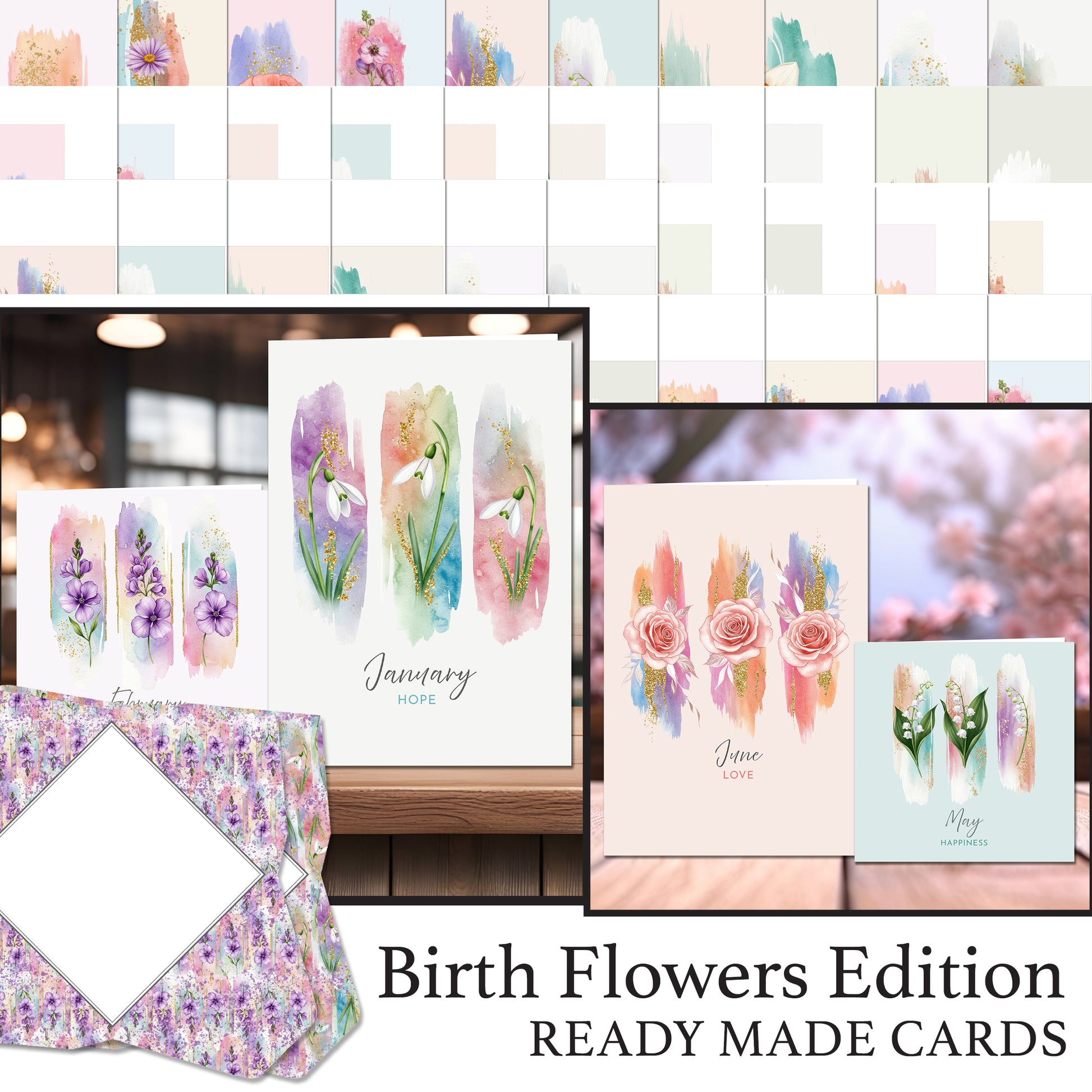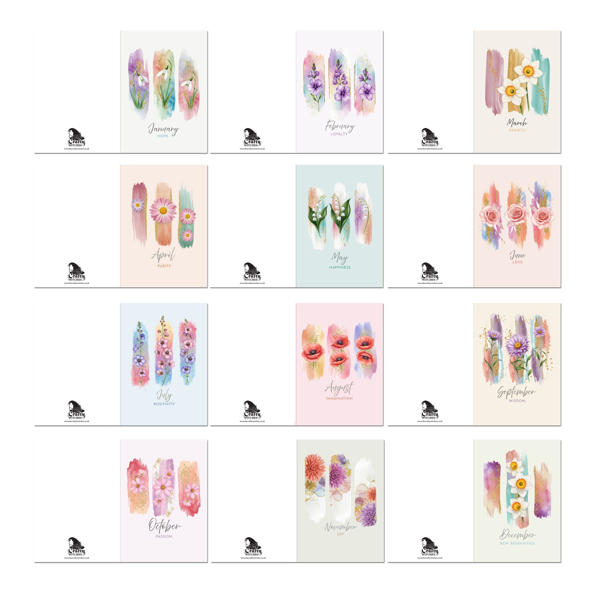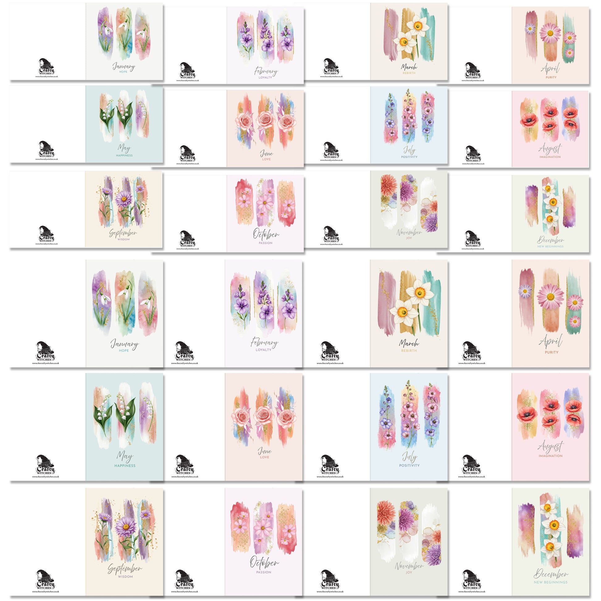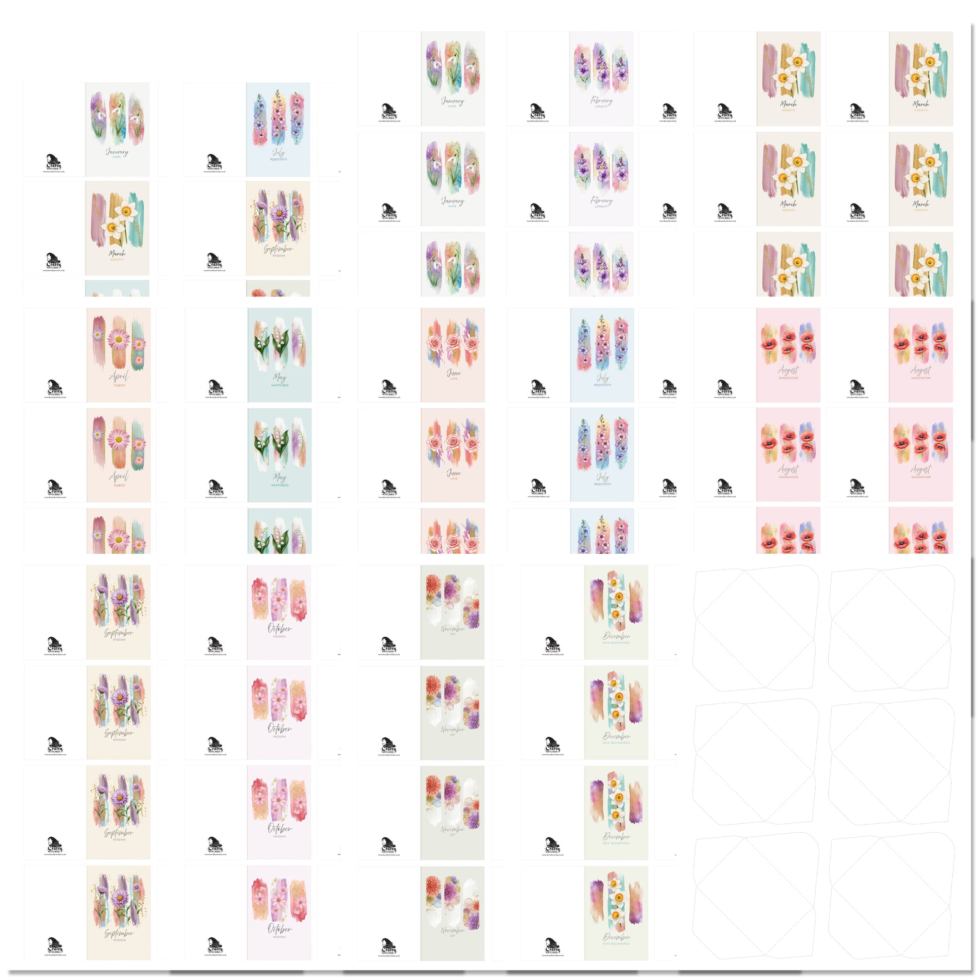 Super easy card makes with this pretty pack of 'Ready Made Cards'. Simply print, cut and score and you're away. Each card design/size comes with perfectly sided envelopes (so simple to construct) and insert designs. There are 12 designs in total over 7 sizes, a total of 84 variants. The flowers represent each of the12 months of the year. There are 252 finished pieces in total including envelopes, gift cards and inserts.