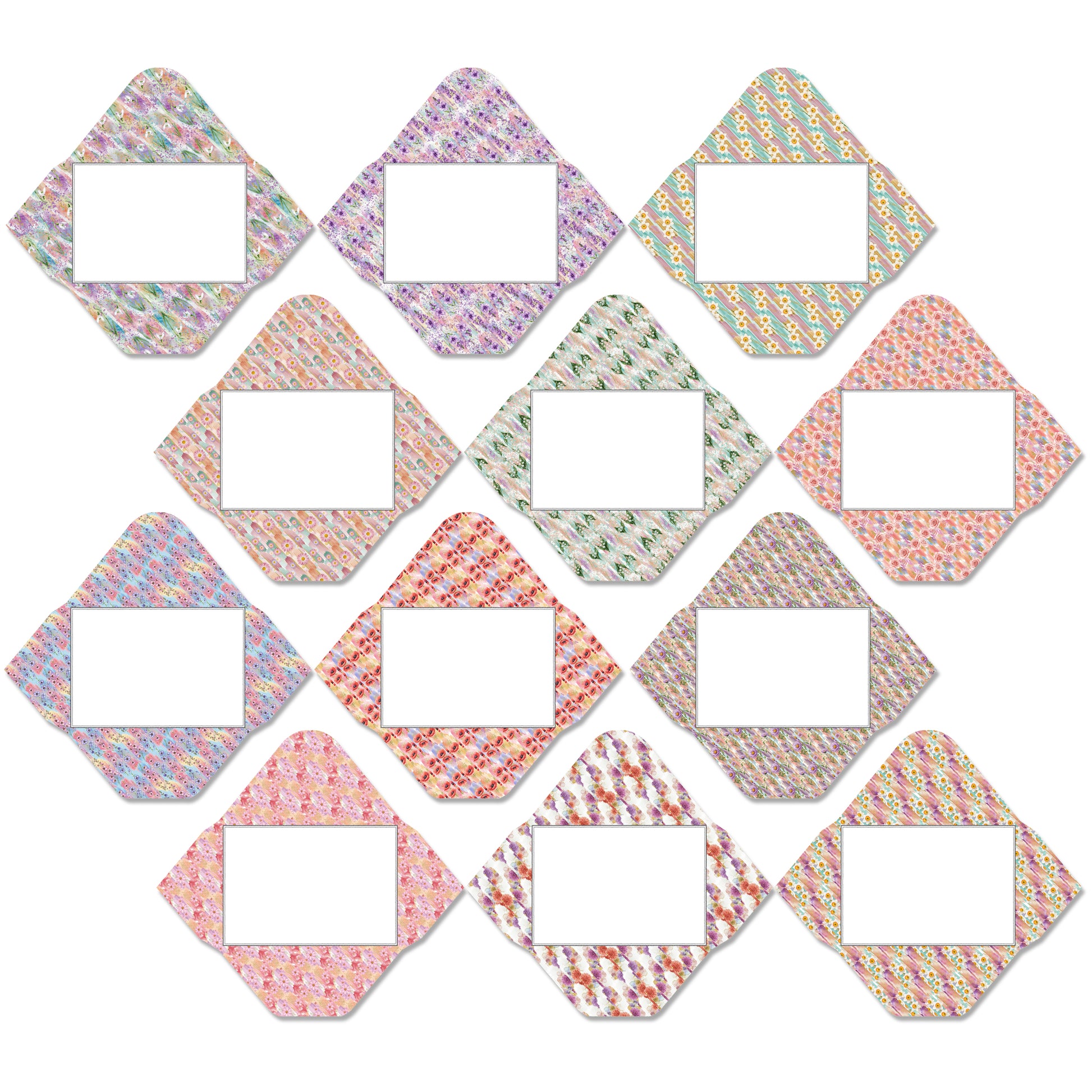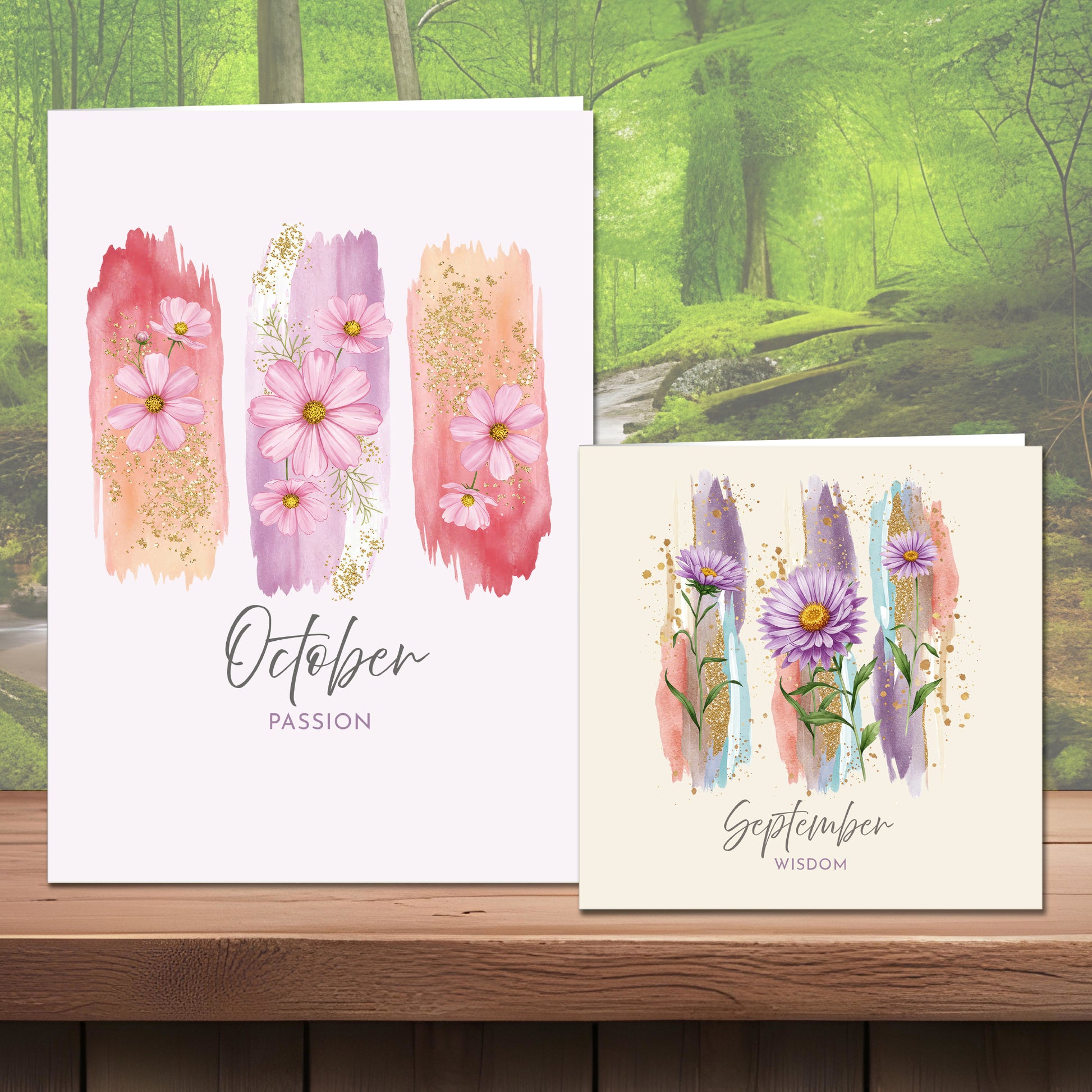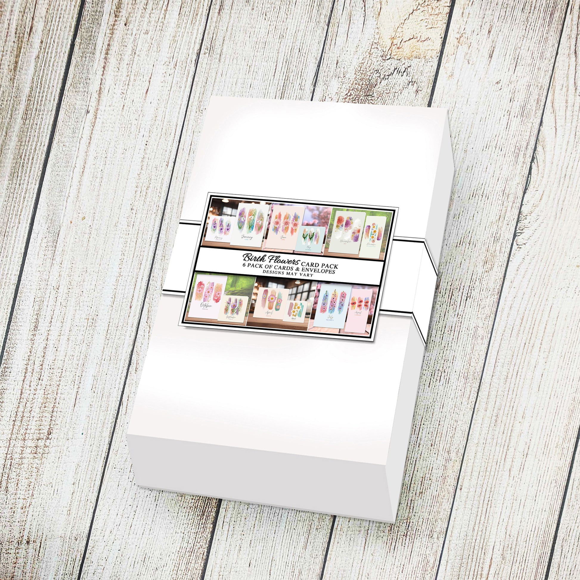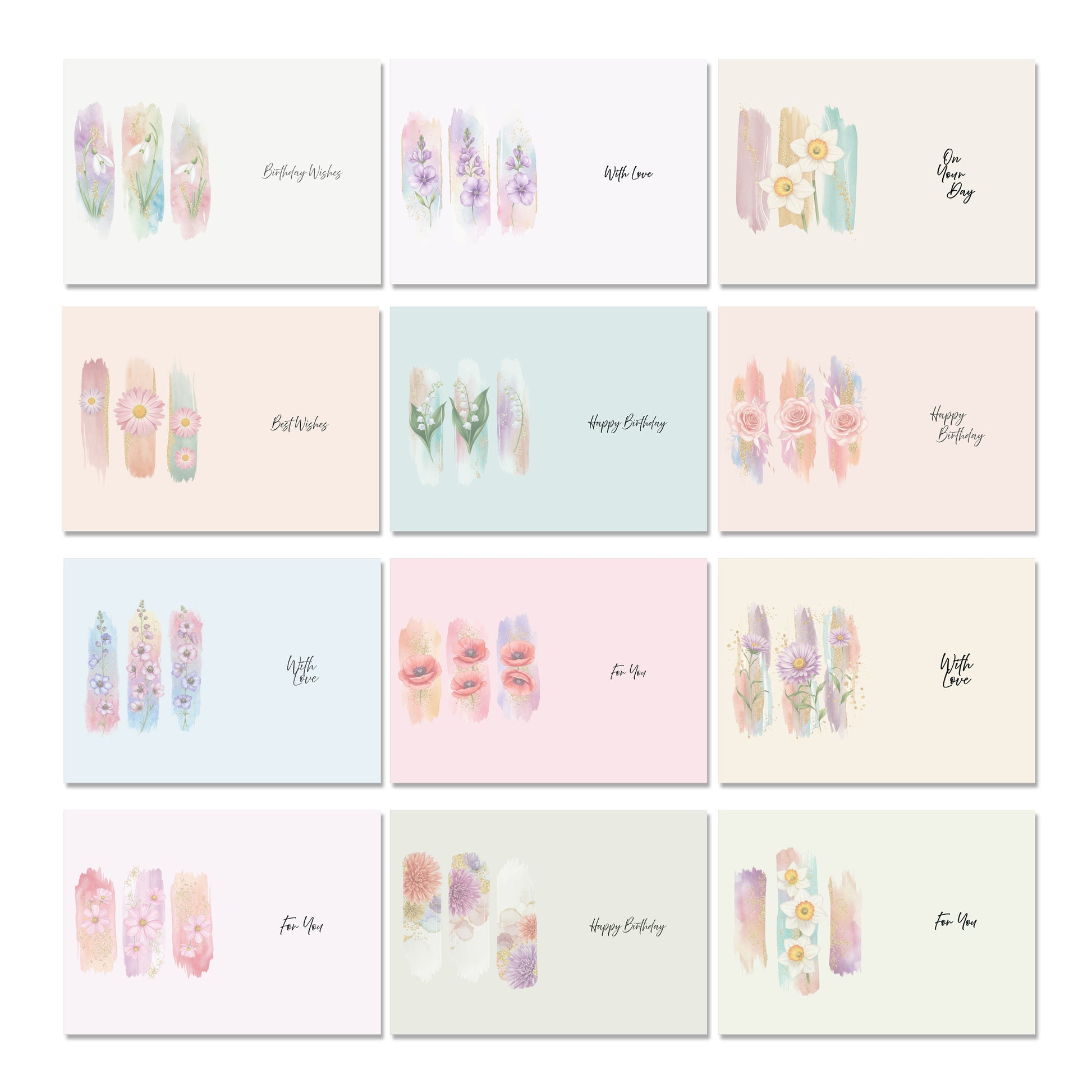 Super easy card makes with this pretty pack of 'Ready Made Cards'. Simply print, cut and score and you're away. Each card design/size comes with perfectly sided envelopes (so simple to construct) and insert designs. There are 12 designs in total over 7 sizes, a total of 84 variants. The flowers represent each of the12 months of the year. There are 252 finished pieces in total including envelopes, gift cards and inserts.