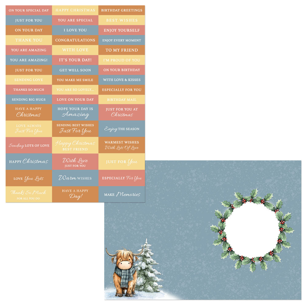 Create pretty Christmas cards using this charming whimsical kit featuring a friendly highland cow 12 x A4 printable sheets