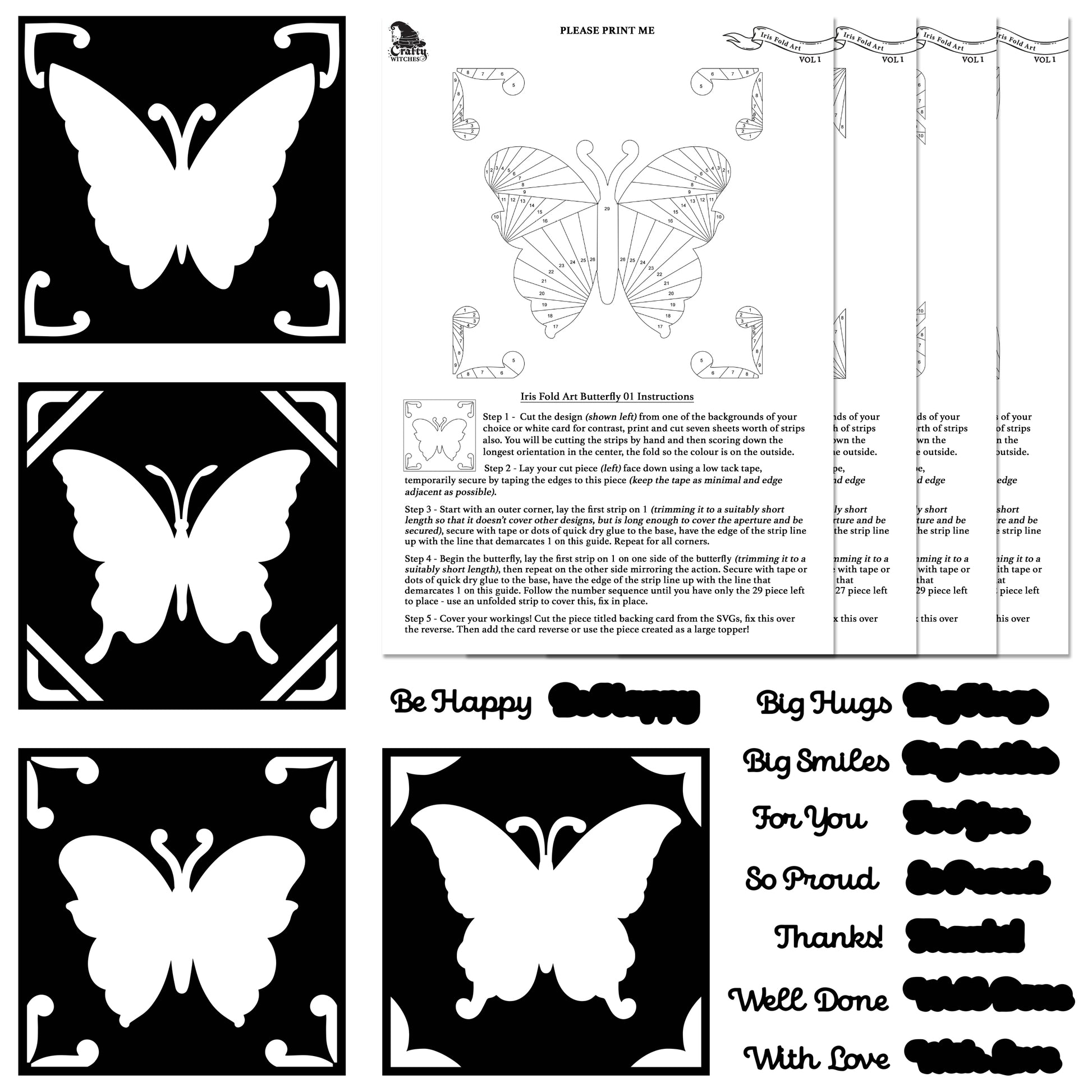 The Crafty Witches Iris Fold Art kit is the first release of a new take on the technique of iris folding. It contains 4 different butterfly aperture designs in SVG format which can be used with electronic machines which can read SVG files.