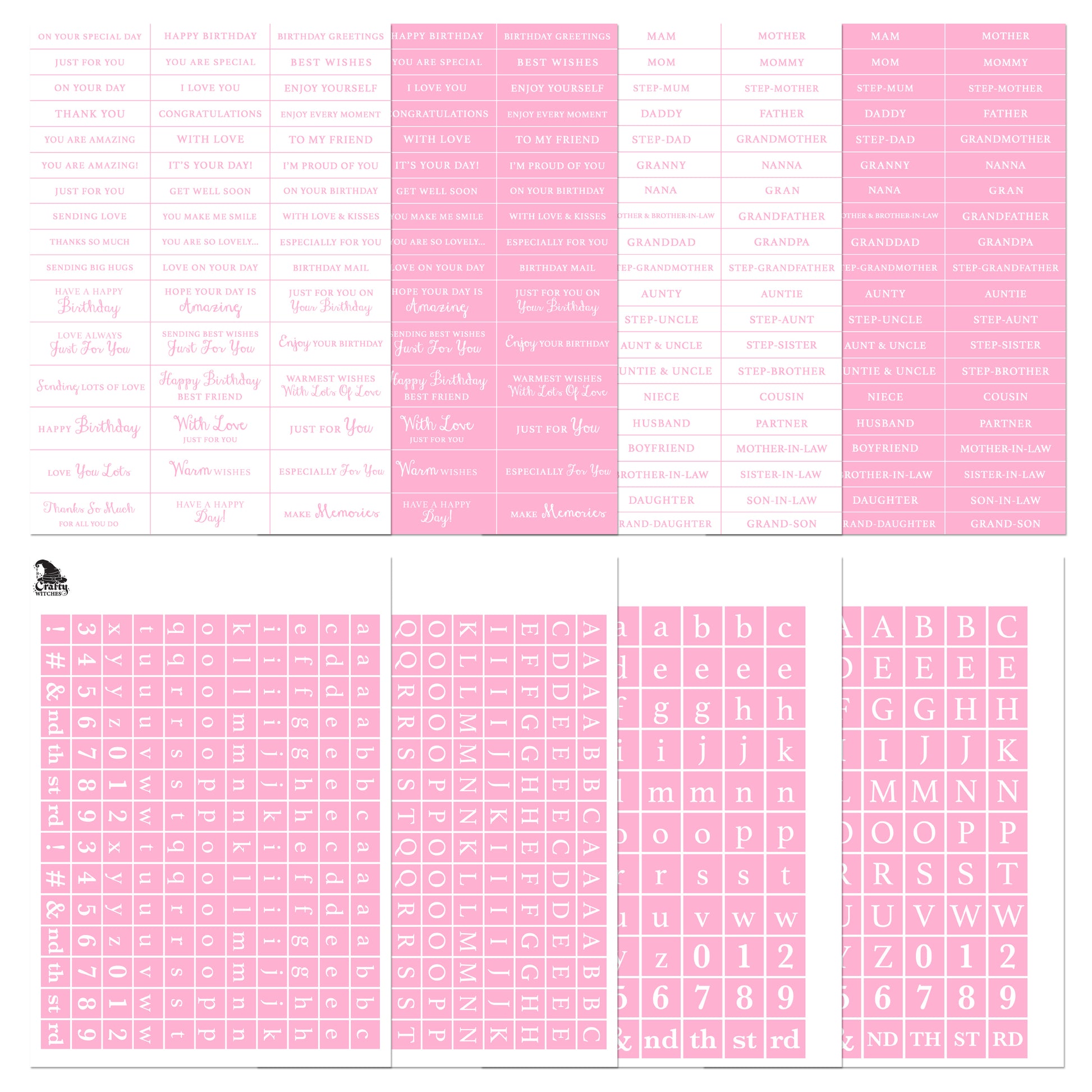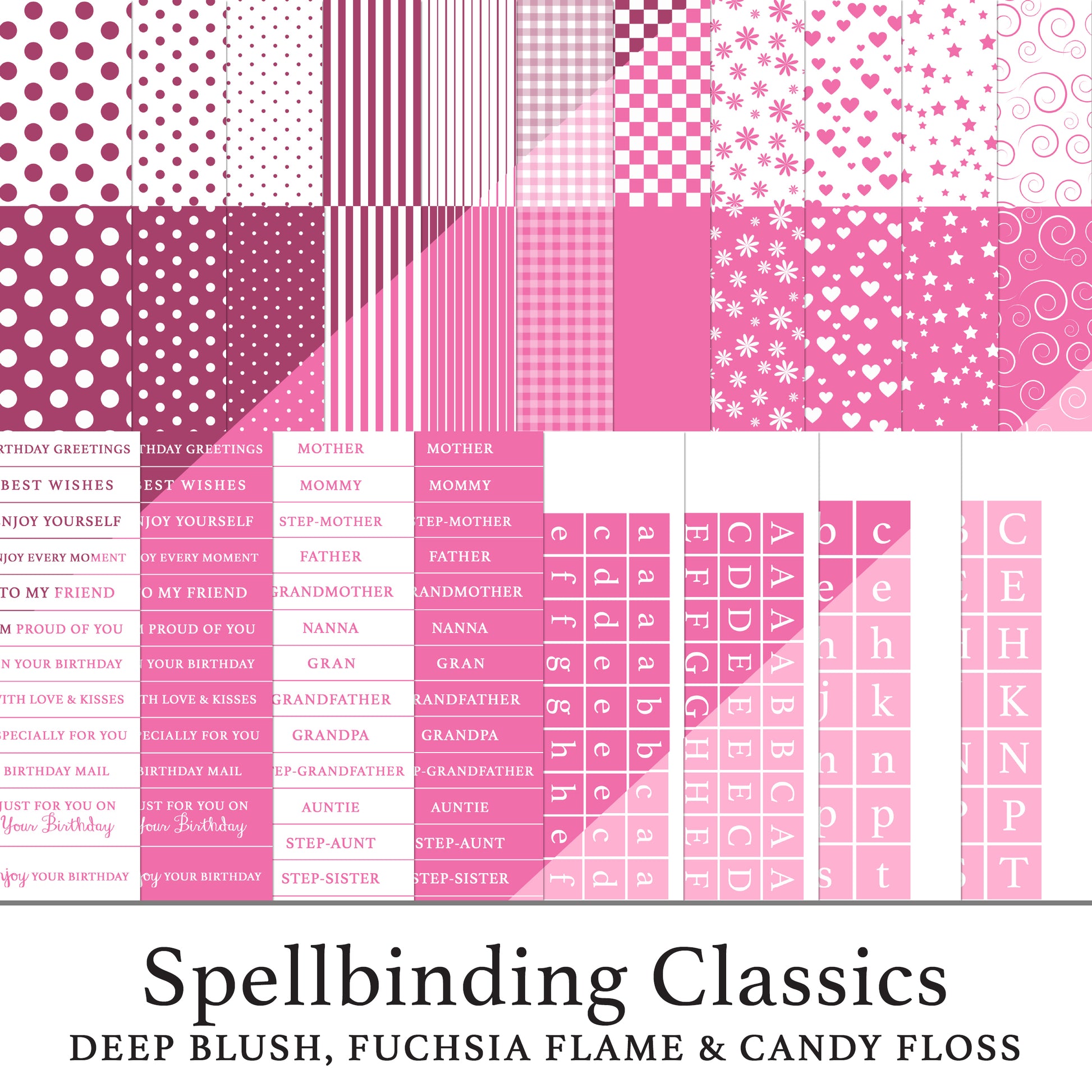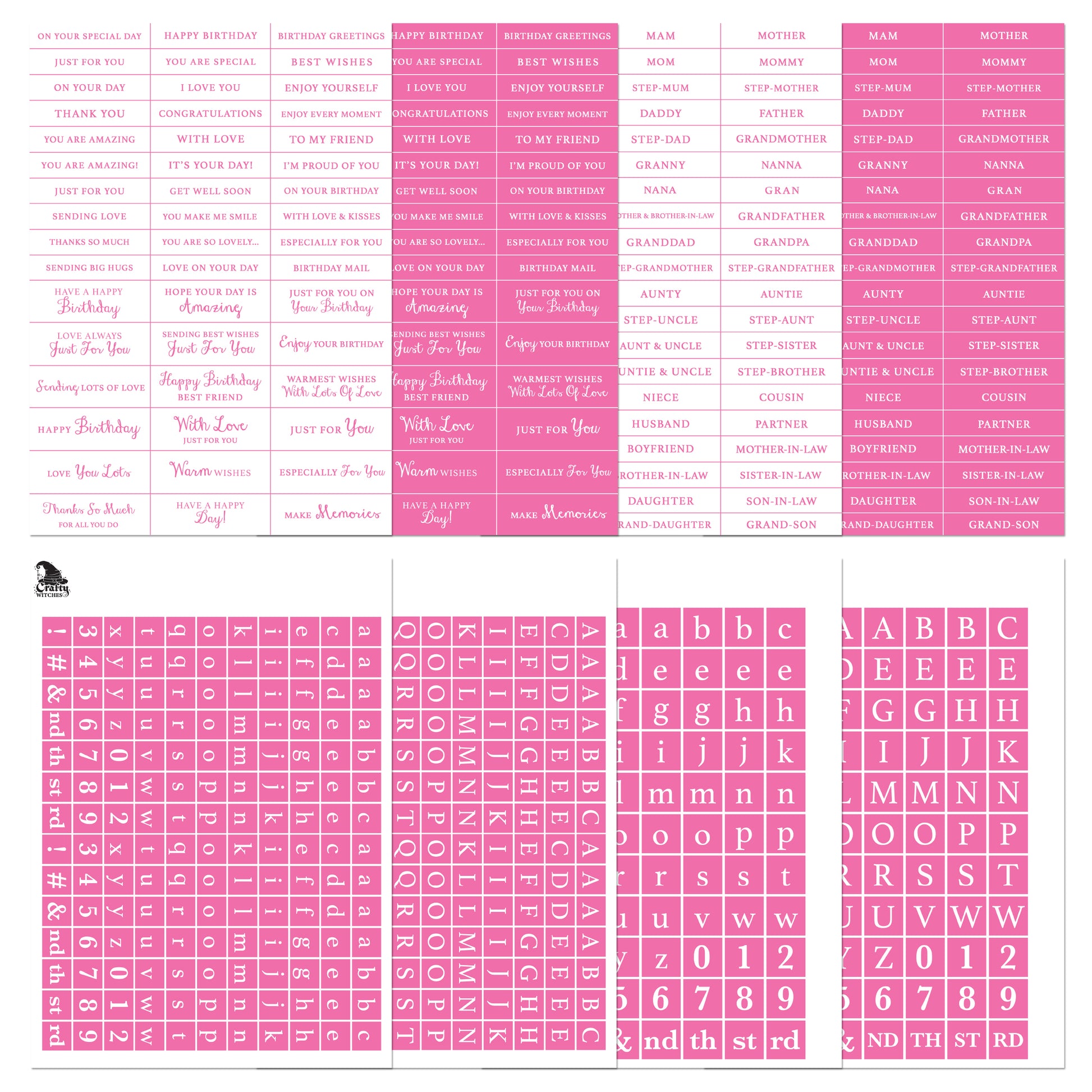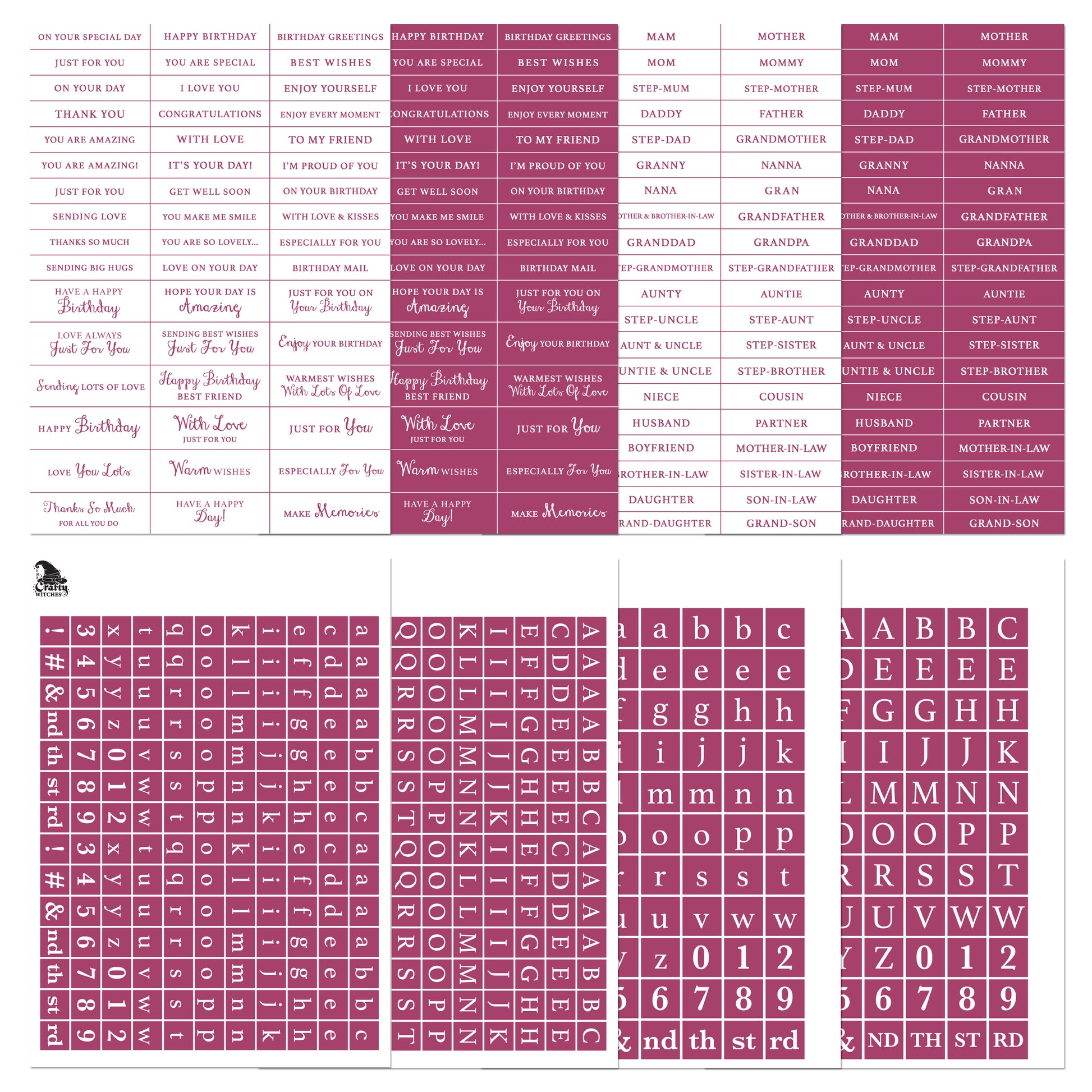 This essential selection features popular patterned A4 designs such as dots, stripes, checks & more plus alphabet tiles, essential sentiments and relations as follows in two versions (one inverted).