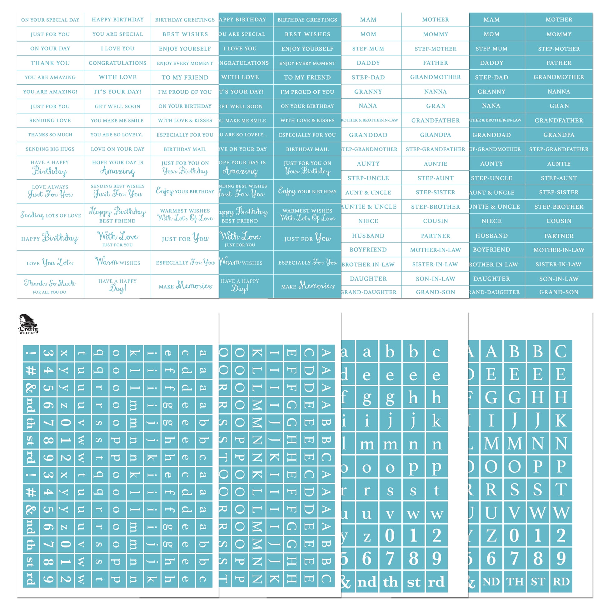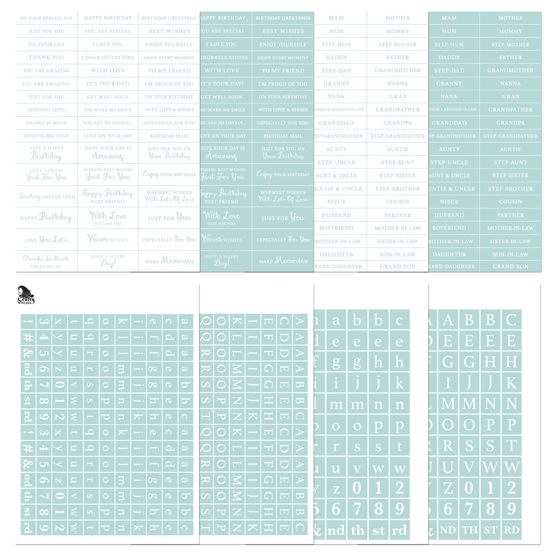 This essential selection features popular patterned A4 designs such as dots, stripes, checks & more plus alphabet tiles, essential sentiments and relations as follows in two versions (one inverted).