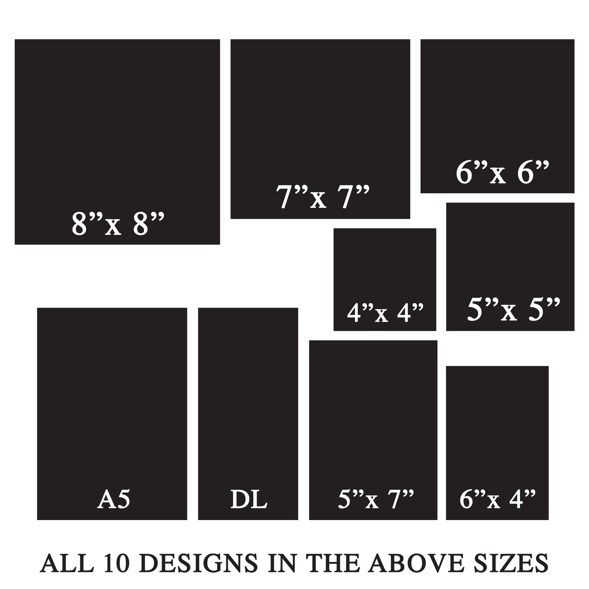 • Card PDF templates in 4" x 4", 5" x 5", 6" x 6", 7" x 7", 8" x 8", DL & A5